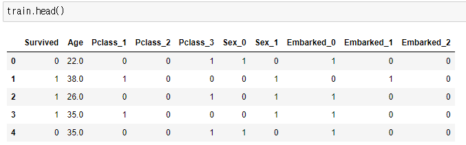 그림 12.와 같이 Pclass, 성별, 승선지에 대한 정보가 각각 dummy Column을 만들어 0과 1로 표현되었습니다.